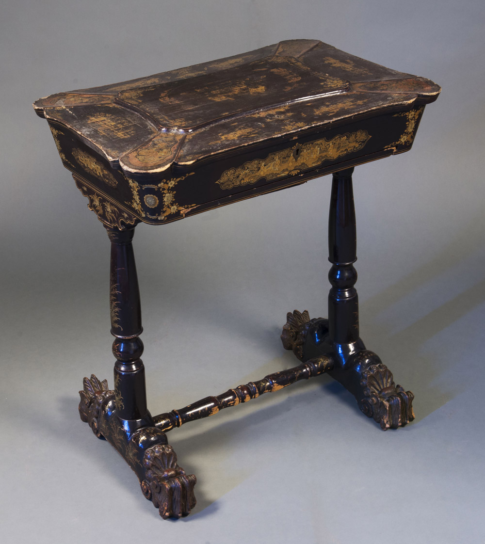 Tavolino portacucito in legno laccato e dorato a paesaggi con figure. Piano apribile celante vani e scomparti con pomoli in avorio tornito. Gambe a colonna riunite da traversa poggianti su piedi a mensola intagliati a volute. Inghilterra sec. XIX (cm 62x74x46) (difetti e mancanze) Parcel-gilt and lacquered wood work-table with ivory knobs. England, 19th century (defects and losses)