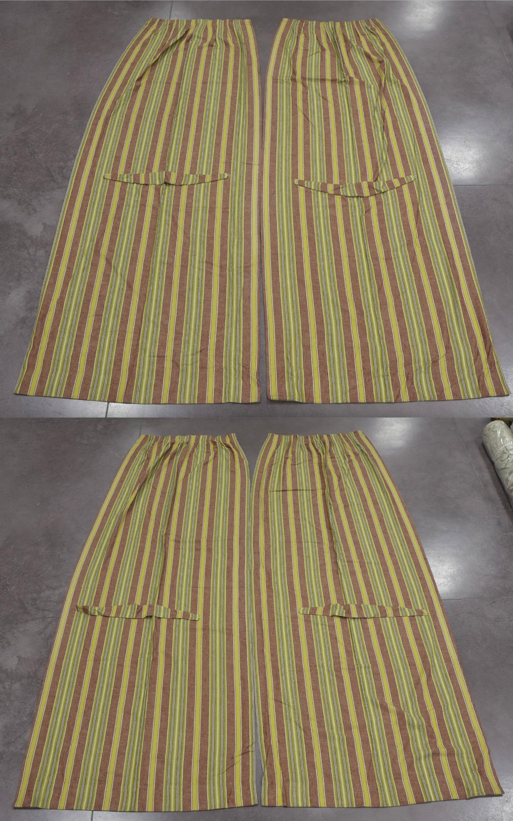 Quattro tende in serge di lino, disegno a righe bordeaux, gialo e verde(cm 320x423)(difetti) Lot comprising two linen serge curtains (defects)