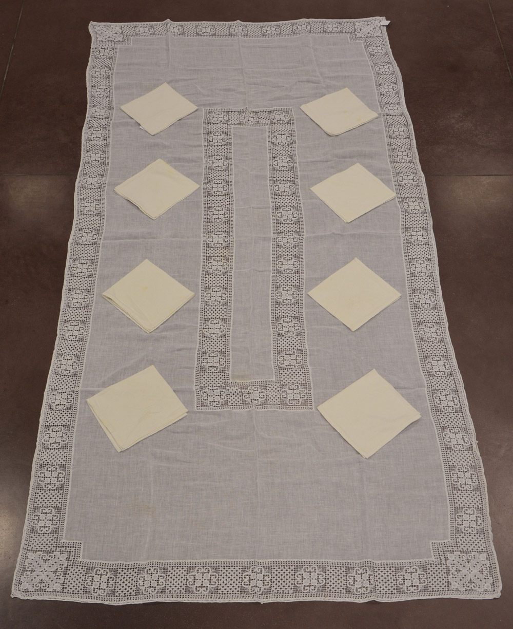 Lotto composto da una tovaglia in lino sfilato e otto tovaglioli. Sec. XXI...