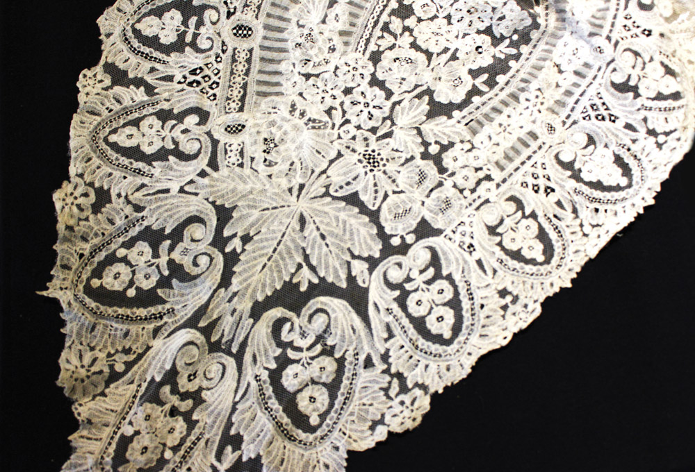 Mantiglia in pizzo bianco di Bruxelles ricamata con motivo ornato. Fine sec....