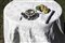 Lotto composto da una tovaglia quadrata in lino di Fiandra di fattura finissima con motivo a greca e monogramma GM ricamato al centro e dodici tovaglioli. Sec. XX (cm 170x170) (difetti, macchie) Lot comprising a square linen tablecloth initialled GM and twelve napkins, 20th century (defects and stains)