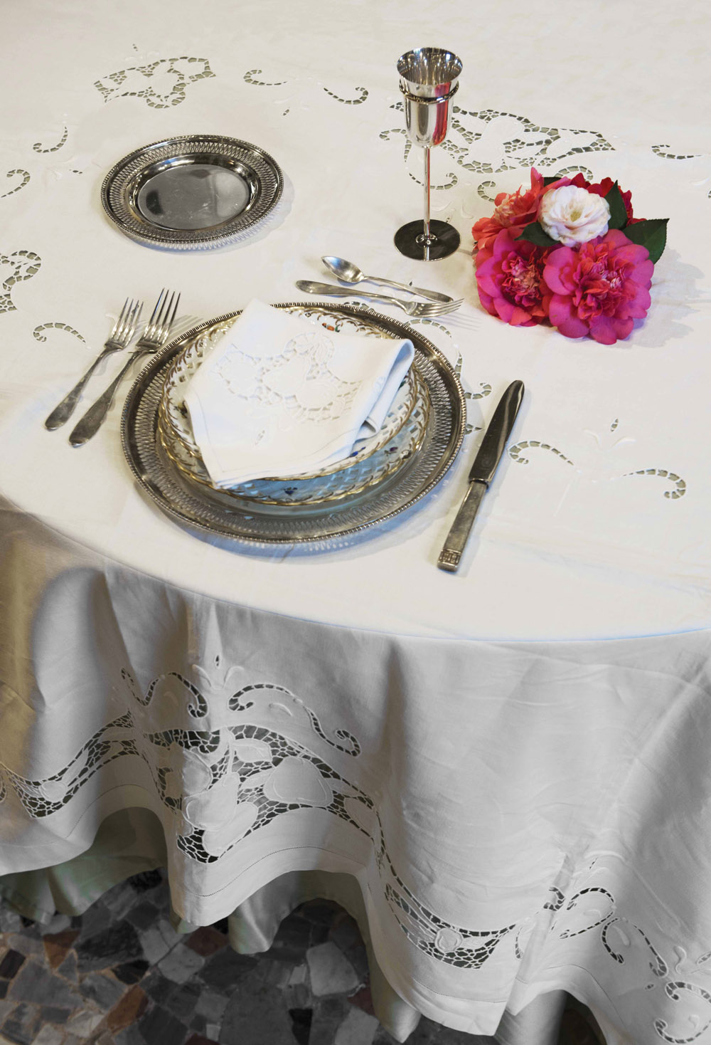 Tovaglia completa di 12 tovaglioli con disegno ad intaglio a mano raffiguante...