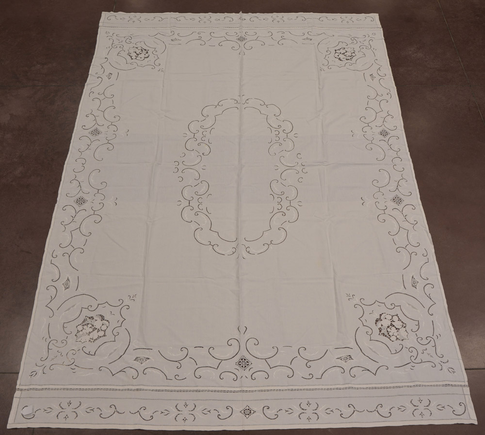 Tovaglia rettangolare in lino con ricami e applicazioni punto ago. Inizio sec. XX (345x220 cm) (lievi difetti) Rectangular tablecloth, early 20th century (minor defects)