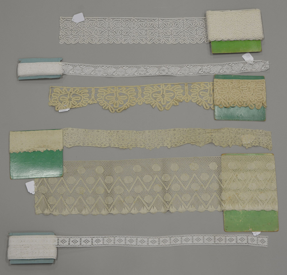 Lotto composto da sei metraggi tombolo, antichi e moderni, tonalità e misure diverse (lievi difetti) Lot comprising six lengths of bobbin lace of different colours, periods and sizes (minor defects)