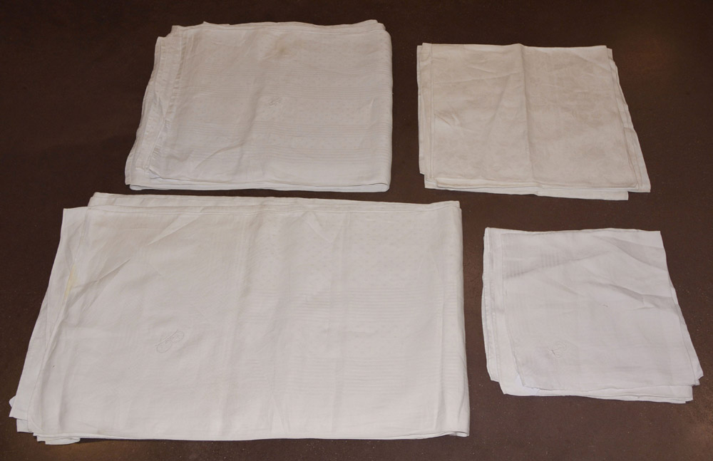 Lotto composto da due tovaglie di forma rettangolare in lino di Fiandra e dieci tovaglioli monogrammati GB. Sec. XX (cm 400x180) (difetti, macchie) Lot comprising two linen tablecloths and ten napkins initialled GB, 20th century (defects and stains)