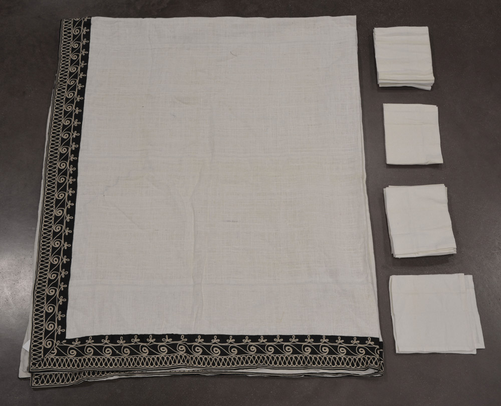 Lotto composto da una tovaglia rettangolare in cotone color avorio con bordura nera e ricamo color beige e dodici tovaglioli. Fine sec. XX (cm 315x240) (lievi difetti) Lot comprising a rectangular cotton tablecloth and twelve napkins, late 20th century (minor defects)