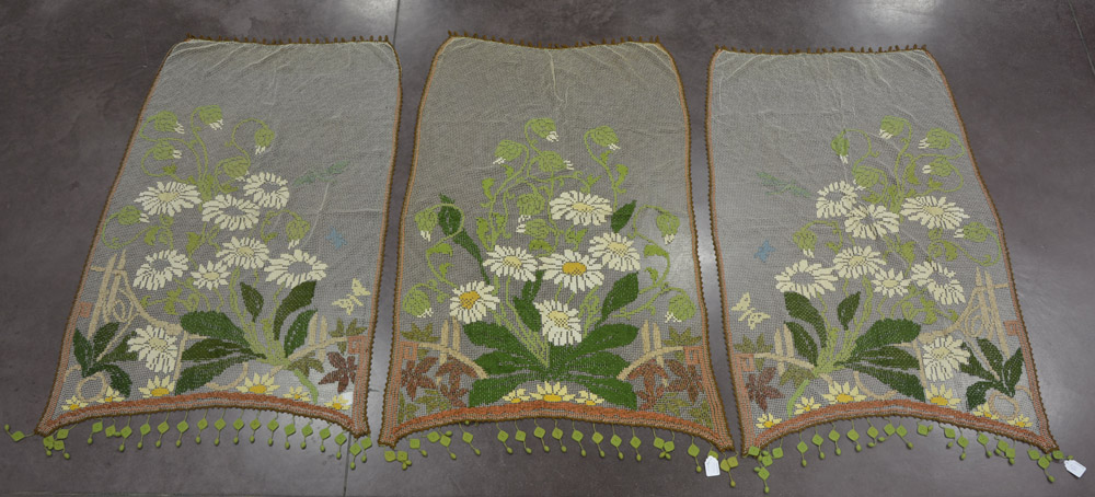 Lotto composto da tre tende filet con ricamo multicolore, motivo floreale e...
