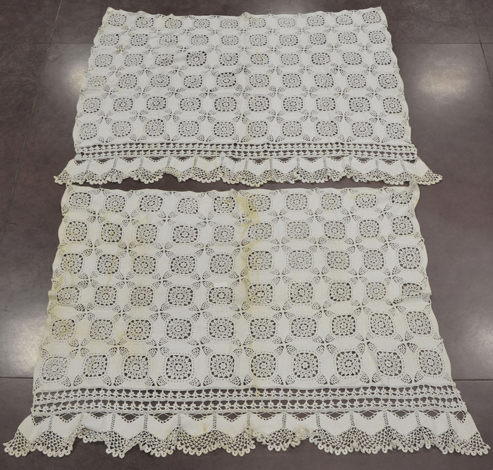 Lotto composto da due copriletto matrimoniali per letti a muro con lavorazione uncinetto. Sec. XX (difetti: macchie diffuse) Lot comprising two bouble-bed bedspreads, 20th century (defects: multiple stains)