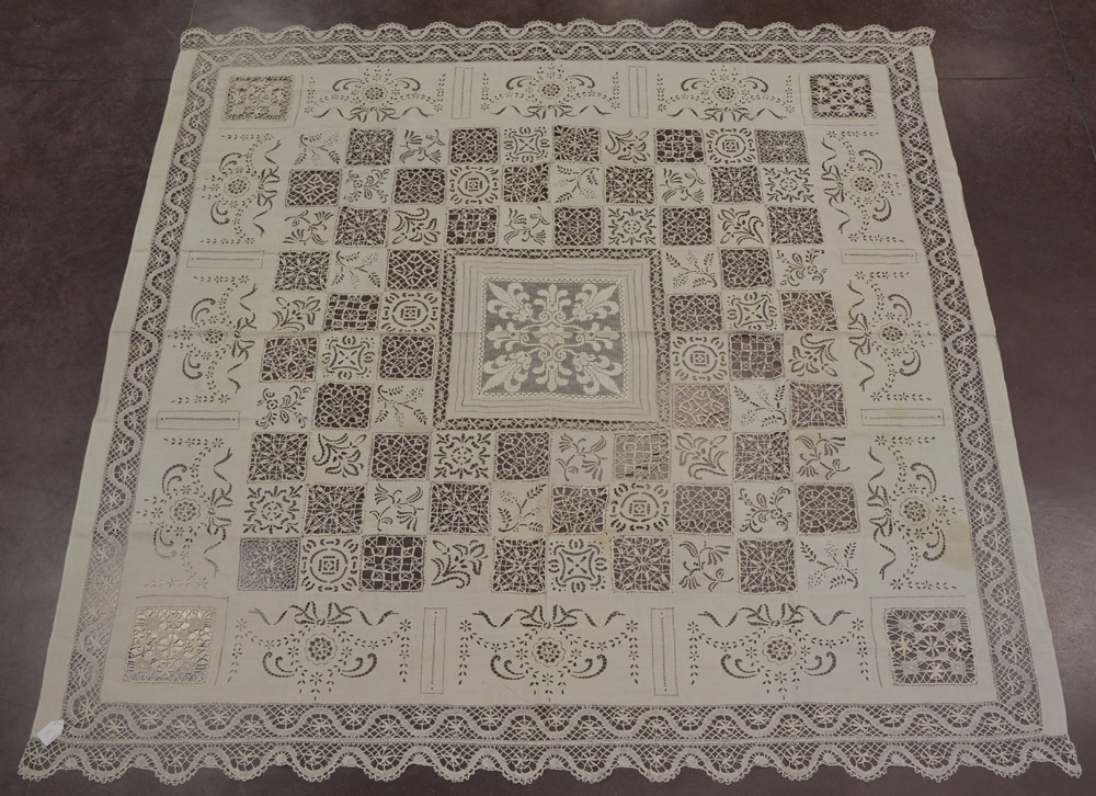 Tovaglia quadrata con inserti al tombolo, punto ago e filet. Sec. XX (cm...