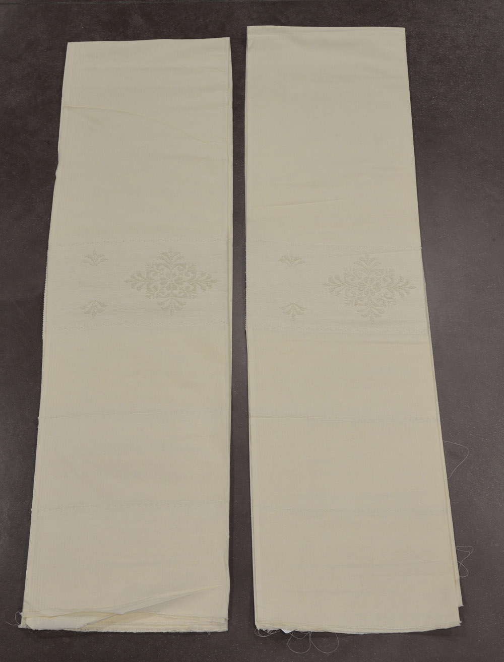 Lotto composto da un paio di tende in lino con ricamo sardo. Sec. XX (cm 370x190) (non rifinite) Lot comprising a pair of woven linen curtains, 20th century (untrimmed)