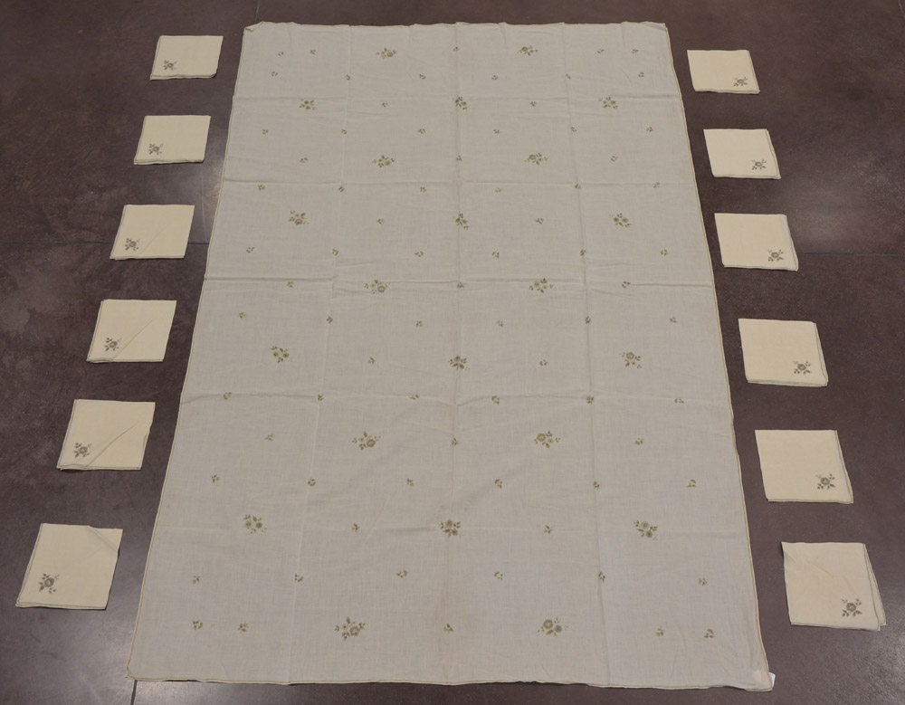 Lotto composto da una tovaglia rettangolare in lino con ricami sparsi di colore beige a punto pieno realizzati mano e dodici tovaglioli. Sec. XX (lievi difetti) Lot comprising a linen tablecloth and twelve napkins, 20th century (minor defects)