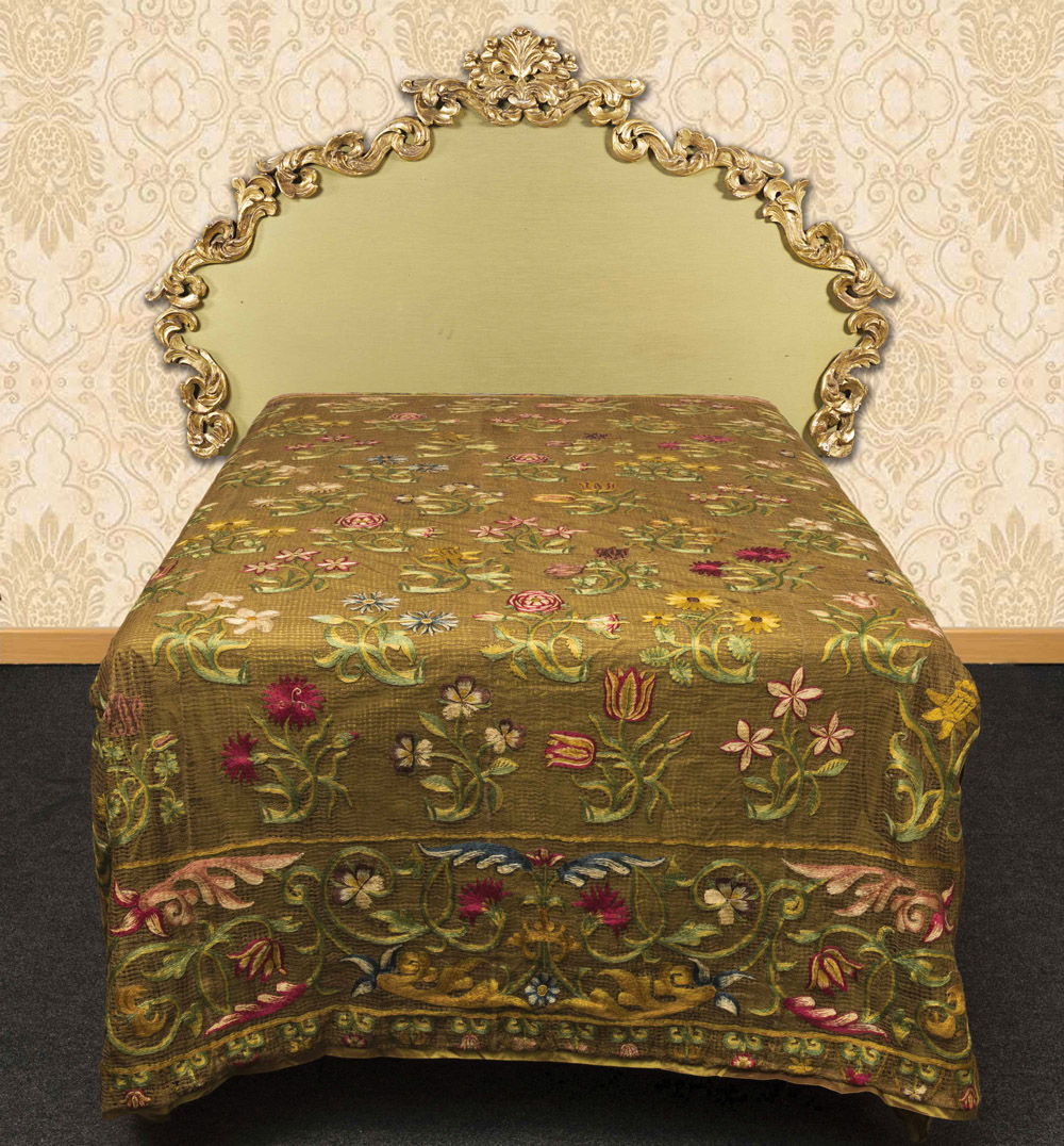 Copriletto in filet a rete a mano e ricamo in seta multicolore di pregiata fattura. Foderato in taffetà di seta (300x240 cm circa) Handmade filet bedspread lined with silk taffeta