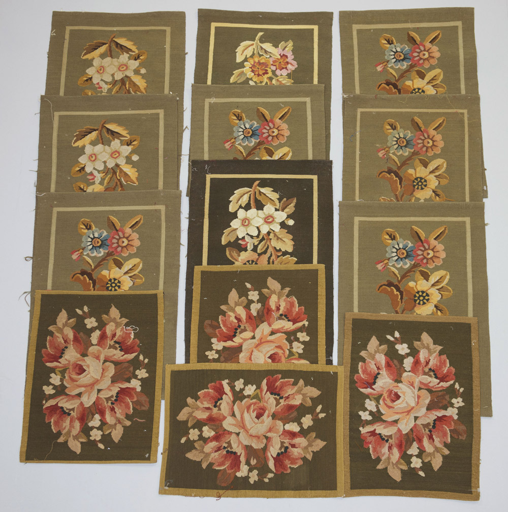 Lotto composto da tredici cuscini ricamati a piccolo punto (49x36cm) con...