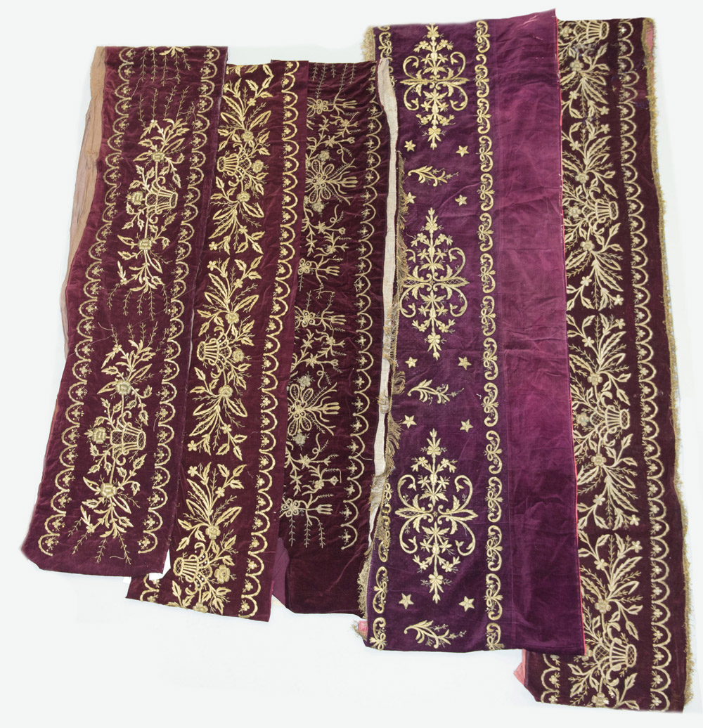 Cinque strisce ottomane di velluto ricamate in filo dorato di misure diverse ( lievi difetti e mancanze) Inizio sec. XX Five ottoman velvet strips decorated with gilt thread (minor defects and losses), early 20th century