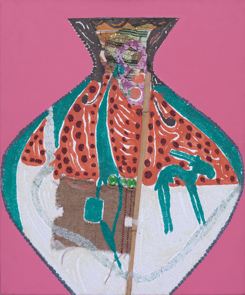 HASSAN FATHI Il Cairo (Egitto) 1957 Contenitore folcolor, Africa tecnica mista, sabbia e applicazioni su tela cm. 60x50, firma e titolo al retro, dichiarazione d'autenticità dell'artista su foto, opera senza cornice.