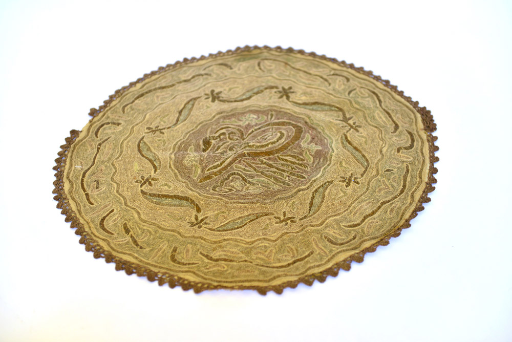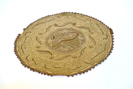 Piccolo tessuto rotondo centrotavola ricamato in argento. Turchia, secoli...
