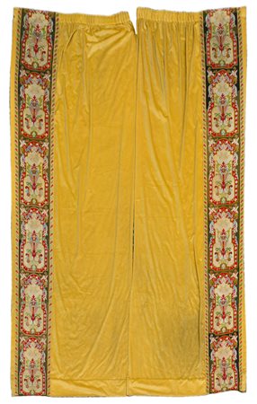 Coppia di tende in velluto giallo bordate con strisce applicate che formano motivi di fantasiosa decorazione, stile neogotico ed eclettico. Seconda metà secolo XIX, cm 290x120. Pair of neogothic and eclectic style curtains velvet curtains. Second half of the 19th century