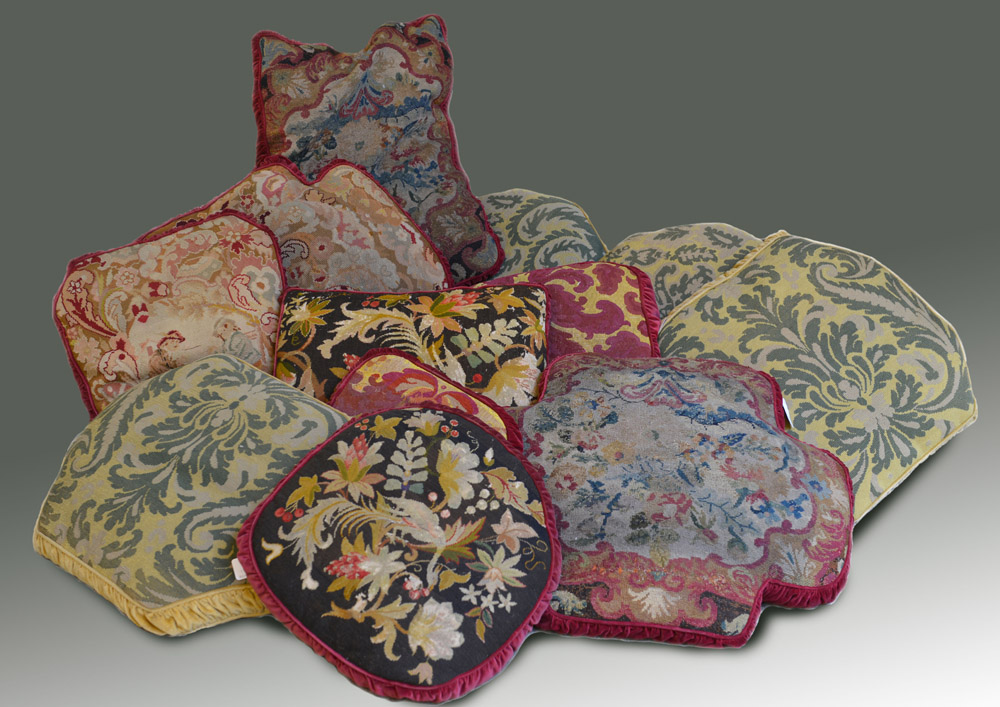Lotto di dodici cuscini eseguiti a piccolo punto con colori a forti tinte e motivi decorativi floreali e vegetali realizzati nella prima metà del sec. XX con sedute di poltrone dei sec. XVII-XVIII Lot comprising twelve petit point needlework cushions made from 17th/18th century armchair seats