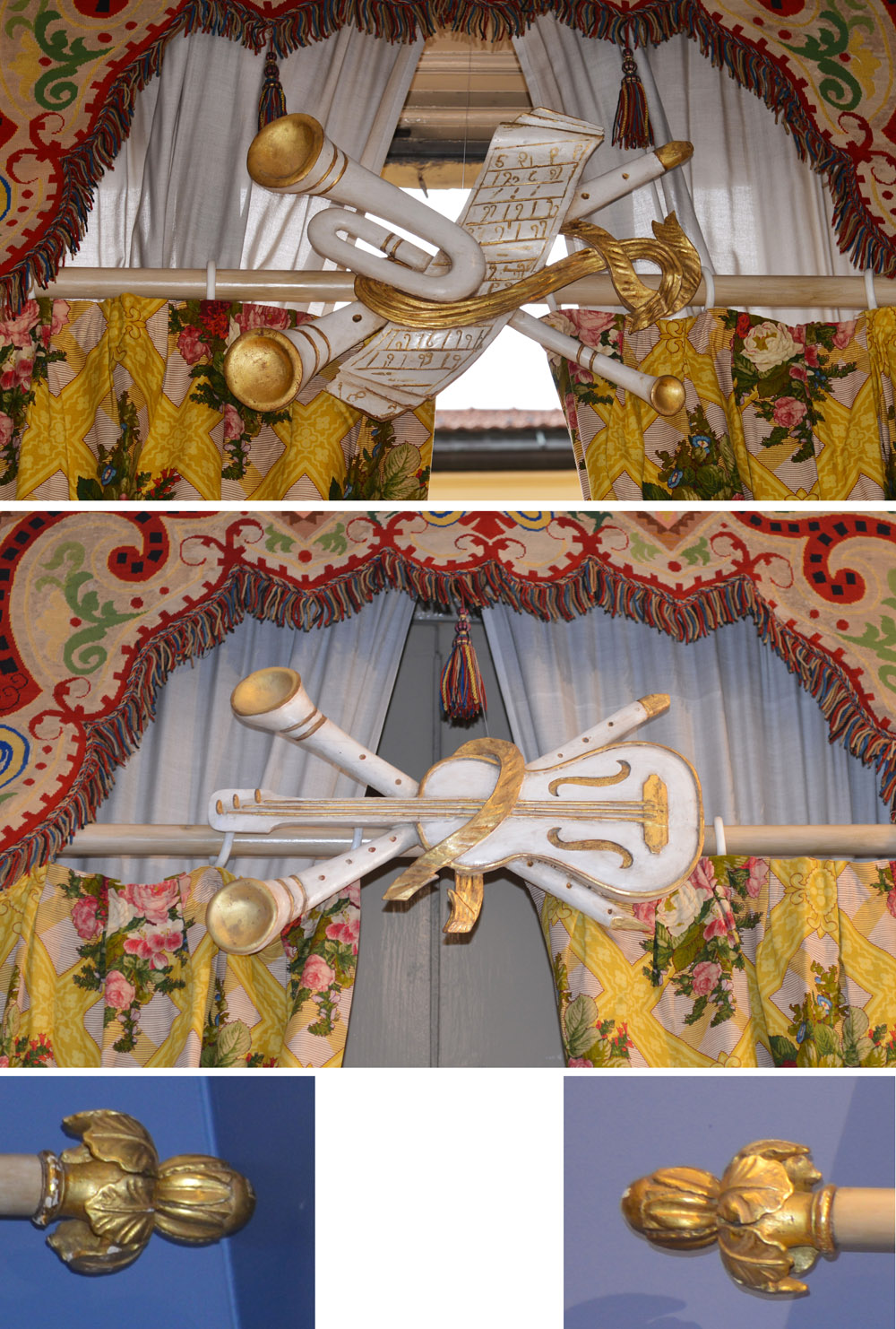 Due bonagrazie laccate di bianco e avorio e dorature con finale a forma di fiore aperto, al centro motivo decorativo con strumenti musicali, uno con viola e clarinetti, l'altro con tromba e un clarinetto, lunghezza cm 230. Two white and ivory lacquered borders