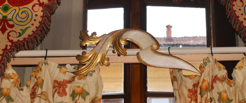 Due bonagrazie laccate in bianco e avorio e dorature con pigne laterali e grande motivo decorativo al centro raffigurante una fogli d'acanto che termina con un cartiglio. Secolo XIX, lunghezza cm 205. Two parcel-gilt white and ivory lacquered borders. 19th century