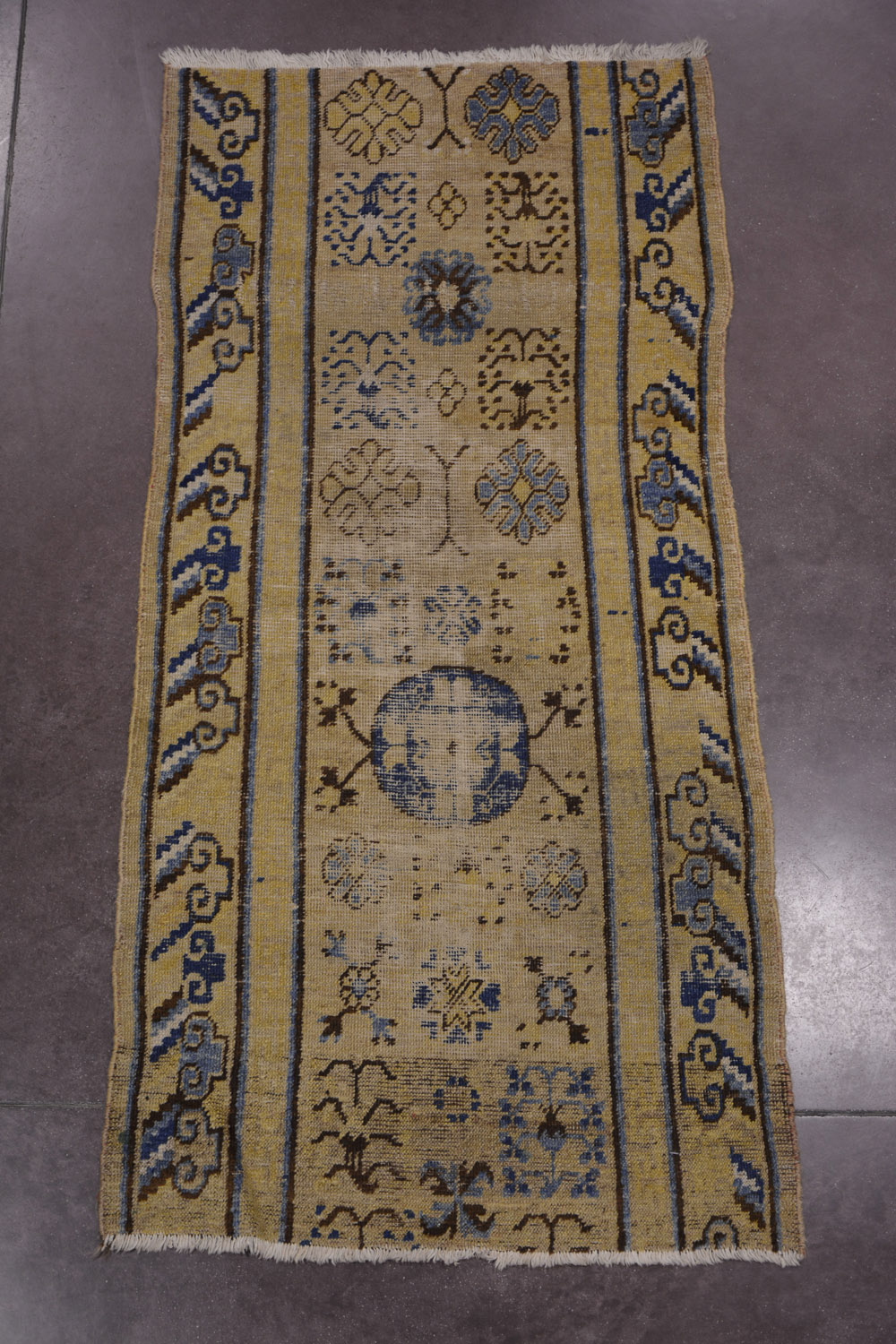 Frammento di tappeto Kohtan turkesain orientale sec. XIX disegno a ideogrammi nei toni del marrone e blu su fondo beige (difetti) (cm 170x65) Fragment of Kohtan carpet, Oriental Turkestan, 19th century (defects)