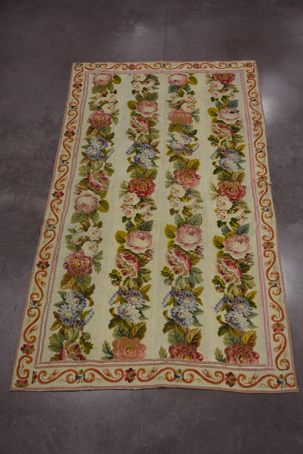 Picolo punto, manifattura europea sec. XIX, disegno a colonne di fori e foglie policromi, bordura a meandro (difetti)(cm 296x170) European manufacture, petit point needlework, 19th century (defects)