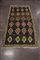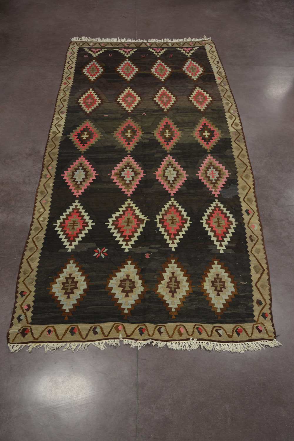 Kilim Karabagh, Caucaso sec. XX disegno a rombi policromi su fondo marrone (cm 395x190)(difetti) Karabagh kilim, Caucasus, 20th century (defects)