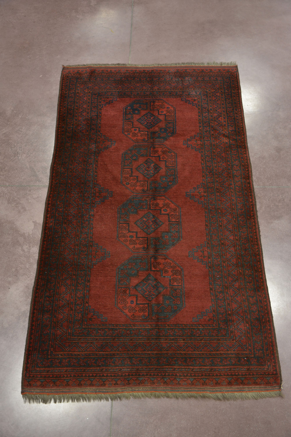 Tappeto Afghan, Turkestan occidentale sec. XX disegno a goul ottagonale su fondo rosso (cm 275x140)(difetti) Afghan carpet, Western Turkestan, 20th century (defects)