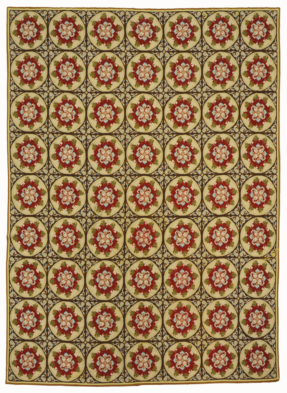 Tappeto piccolo punto, Europa sec. XX disegno a ogive rotonde con fiori in policromia su fondo marrone (cm 270x395)(difetti) Petit-point needlework carpet, Europe 20th century (defects)