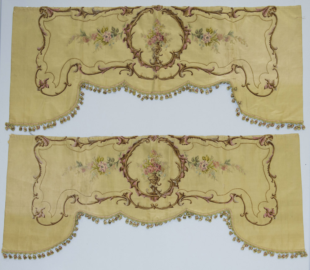 Coppia di mantovane con frange, ricamate in velluto a decoro floreale Sec. XX Pair of lambrequins with fringes, 20th century