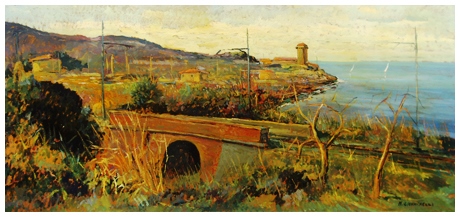 NELLO GIOVANNELLI Livorno 1922 – Livorno 1996 Senza titolo (Ponte di Calafuria) Olio su faesite 40,2 x 86,2. Firma in b. a d.; sul verso firma e località + etichette galleria Athena, Livorno.