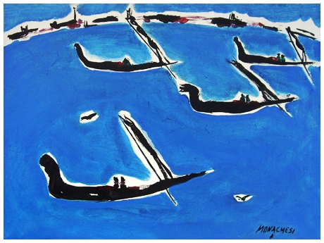 SANTE MONACHESI Macerata 1910 – Roma 1991 Senza titolo Olio su tela 40 x 60. Firma in b. a d. Autentica e arch. Giacomo Tommolini, Roma su foto.