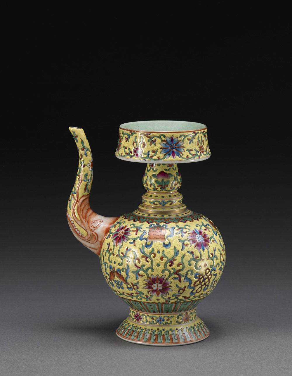 Versatoio in porcellana famiglia rosa su fondo giallo, composto in due sezioni, il beccuccio decorato alla base con una creatura mitologica dalla lunga proboscide, il corpo decorato con fiori di loto stilizzati, l'interno e la base turchesi, marchio apocrifo Qianlong (piccoli difetti) Cina, sec. XX A yellow-ground famille rose ewer, composed in two sections, the spout shaped as a long-trunk mythical creature, the body with lotus flowers, Qianlong apocryphal mark China, 20th century (h cm 21)