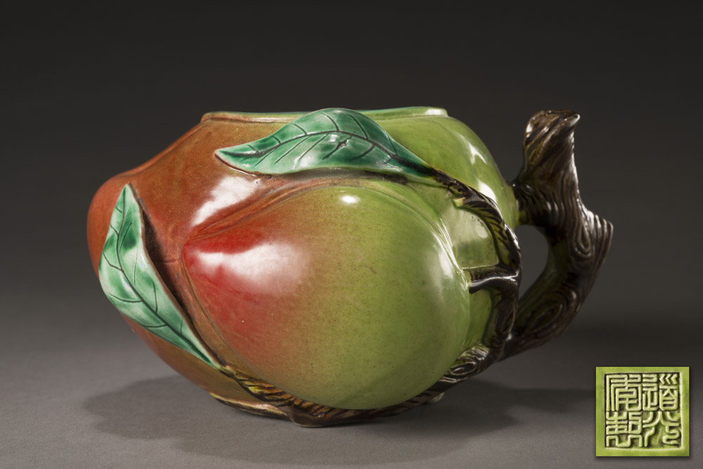 Lavapennelli in porcellana policroma a forma di pesca, composto da due frutti e ramo modellato naturalisticamente con foglie, interno turchese, marchio apocrifo Daoguang alla base Cina, sec. XX A polychrome "peach" brushwasher, composed by two conjoined fruits on a leafy gnarled branch, the interiore turquoise, apocryphal Daoguang mark to the base China, 20th century (h cm 15)