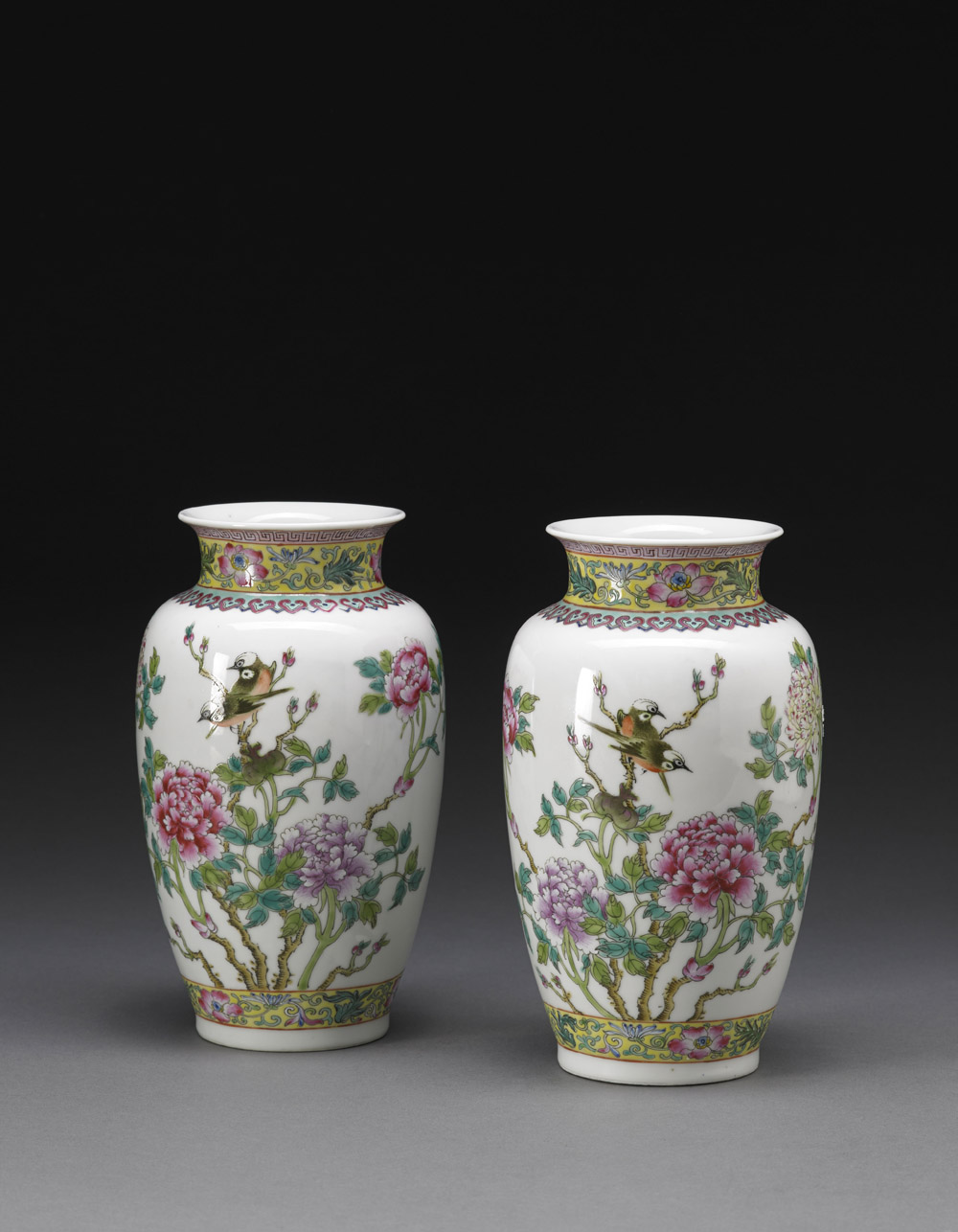 Coppia di vasetti in porcellana decorata con smalti della Famiglia Rosa con rondini e fiori di peonia, marchio apocrifo Qianlong Cina, sec. XX Pair of Famille Rose vases, decorated with swallows resting on the tree branch with peony blossoms, apocryphal Qianlong mark to the base China, 20th century (h cm 21)