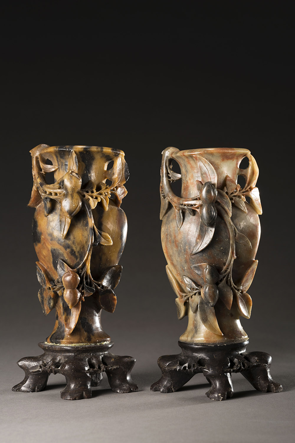 Coppia di piccoli vasi a balaustro in pietra saponaria, con decorazione di rami di pesco intagliati, la pietra di un color marron rossiccio con striature più scure, con basi in pietra Cina, sec. XX A pair of soapstone baluster vases decorated with carved and pierced fruiting peach branches, the stone of brown and reddish tones with darker inclusions, with soapstone bases China, 20th century (h cm 15)