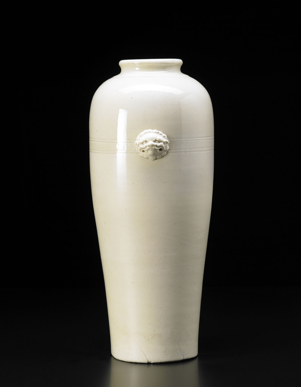Vaso in porcellana morbida a invetriatura craquelé rastremato al piede, con alta spalla terminante a bocca stretta e labbro everso, sotto la spalla, una fascia a greche leiwen e in corrispondenza due anse a testa leonina (restauro) Cina, dinastia Qing (1644-1911) A white craquelé glazed vase, with two decorative lion handles (restored) China, Qing dynasty (h cm 36)