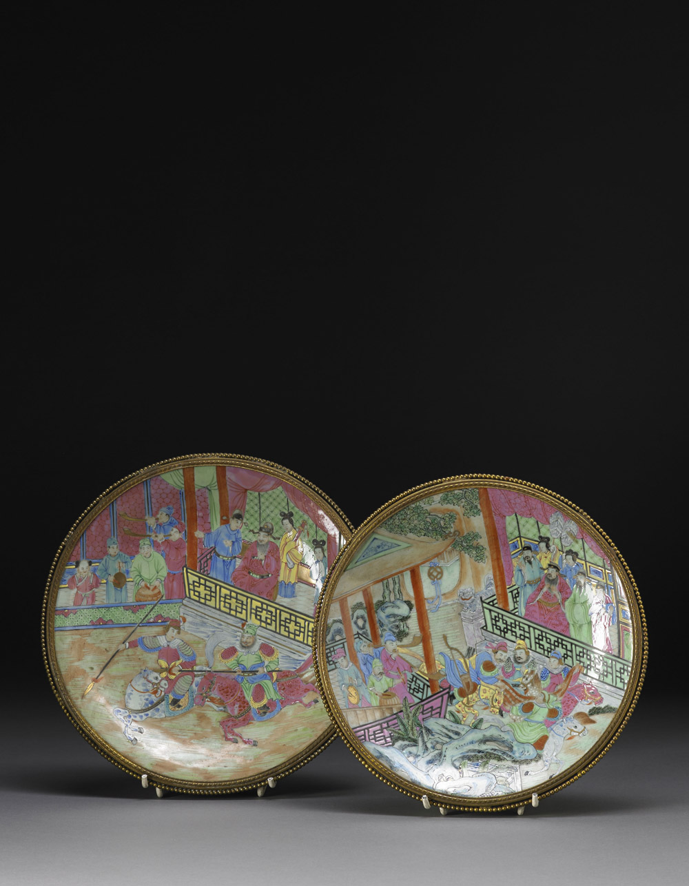 Coppia di piatti in porcellana cantonese Famiglia Rosa su fondo celadon, decorati in smalti e dorature con dignitari che osservano una battaglia di guerrieri a cavallo, marchio apocrifo Qianlong alla base, montatura di bronzo dorato ai bordi Cina, sec. XIX A pair of Cantonese Famille Rose porcelain dishes, each decorated in gilt and enamels with dignitaries looking at a battle of riding warriors, apocryphal Qianlong mark to the base, with gilt bronze mounts to the rims China, 19th century (d cm 27,5)