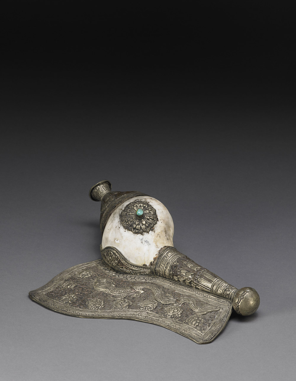 Una tromba rituale composta da una grande conchiglia con montatura in argento...
