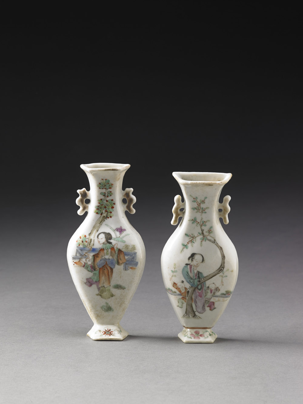 Coppia di vasi da parete decorati con figure di dame e bambini negli smalti della Famiglia Rosa, fencai, marchio in rosso a forma di pipistrello sul fondo (leggere perdite di vetrina sul labbro) Cina, Jingdezhen, fine XIX/inizio XX secolo A pair of Famille Rose porcelain wall vases (some wear to the rim) China, late 19th/early 20th century (h cm 15)