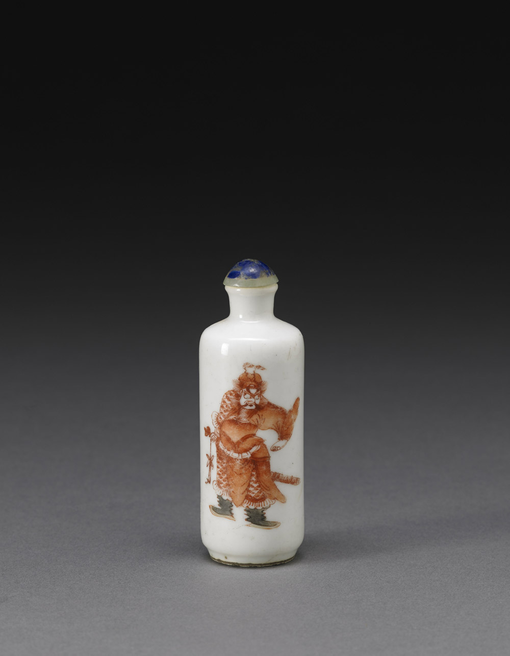 Snuff bottle in porcellana decorata in rosso ferro con Zhong Kui, marchio apocrifo Qianlong (felure) Cina, XIX/XX secolo A porcelain snuff bottle decorated in iron red with Zhong Kui, apocryphal Qianlong mark (one crack) China, 19th/20th century (h cm 8)