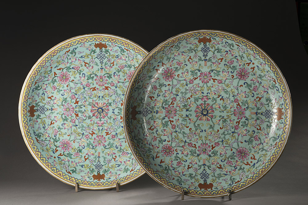 Coppia di grandi piatti in porcellana in Famiglia Rosa su fondo turchese, decorati con fiori di loto, pipistrelli e nodo buddhista, contornati da fitto fogliame, il bordo con teste di ruyi, la base turchese con marchio apocrifo Qianlong (lievi mancanze e difetti della doratura) Cina, inizio sec. XX A pair of turquoise ground Famille Rose large dishes, decorated with lotus flowers, bats and Buddhist "endless knots" interspersed with dense scrolling foliage, the turquoise base with apocryphal Qianlong mark (minor losses and flaws to the gilt) China, early 20th century (diam. cm 39,5)