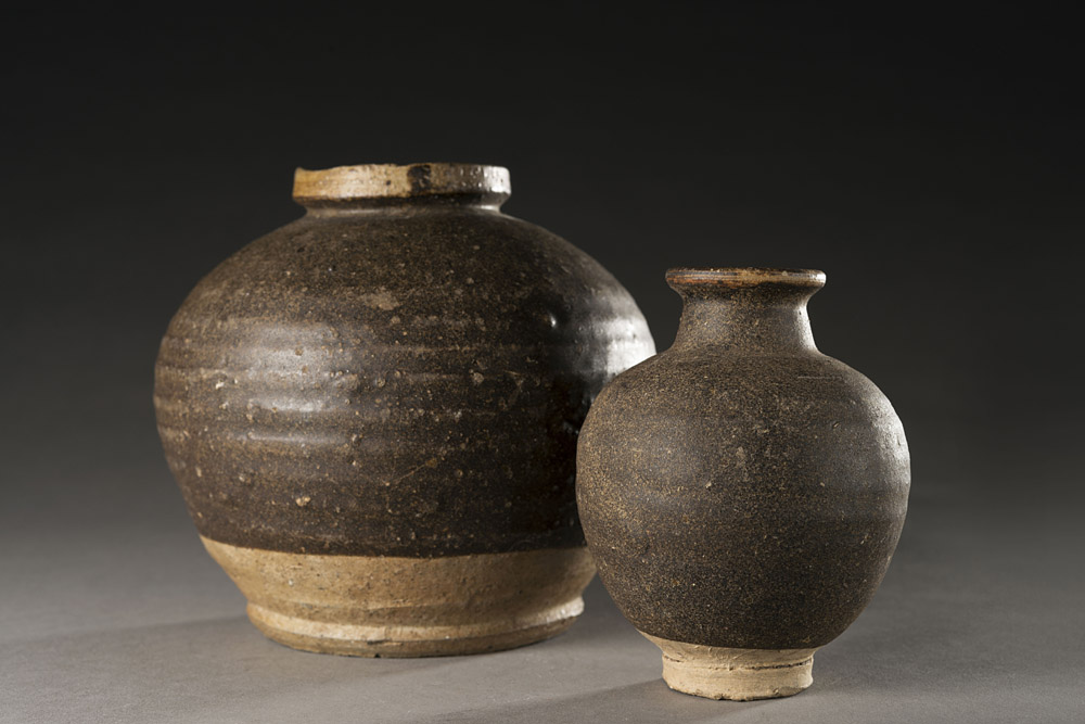 Due piccole giare dalla forma bombata smaltate in marron scuro Cina, dinastia Song (960-1279) o più tardi Two small jars with dark brown glaze China, Song dynasty or later (h max. cm 11)