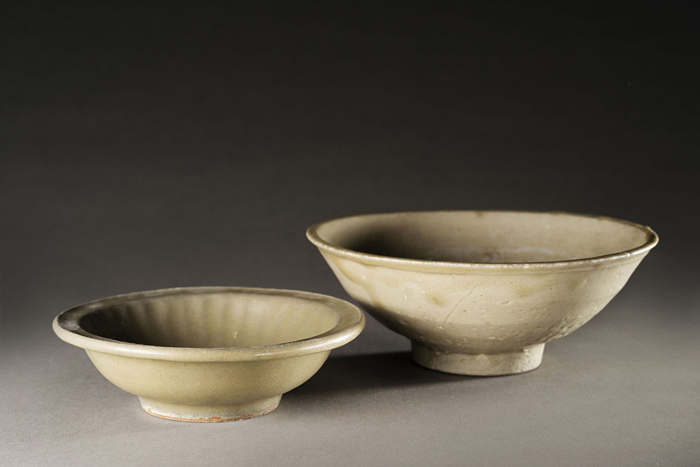 Due ciotole, una color celadon e una smaltata in grigio, decorate con...