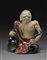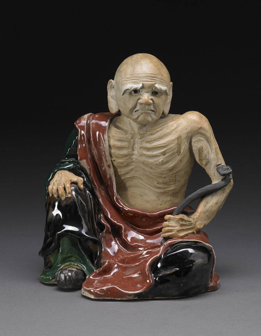 Luohan in ceramica invetriata in marrone, nero e verde, la figura emaciata raffigurato seduto con un ginocchio piegato e con vesti morbide, espressione facciale naturalistica, nella mano sinistra uno scettro ruyi Cina, XIX/XX secolo A ceramic evacuated luohan, glazed in black, brown and green, depicted seated, with loose robes, one knee raised, with a naturalistic expression, carrying a ruyi sceptre in his left hand China, 19th/20th century (h cm 26)