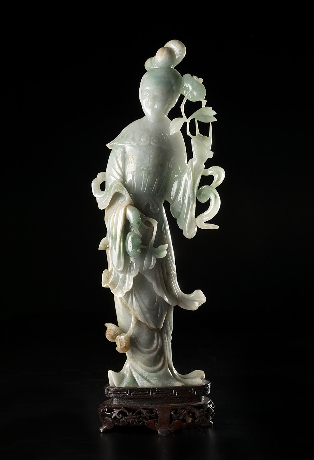 Scultura in giadeite raffigurante una donna con capelli raccolti, indossa lunghe vesti e porta rami di lingzhi, con base di legno, la pietra di varie tonalità di verde e ruggine, con difetti naturali Cina, dinastia Qing, sec. XIX Collezione privata milanese, acquisito inizio XX secolo in Cina A jadeite figure of a lady with knotted hair, wearing long flowing robes and carrying lingzhi branches, with wood stand, the stone of green and rust tones with natural flaws China, Qing dynasty, 19th century (h cm 24) From a private Milanese collection, acquired in the early 20th century in China
