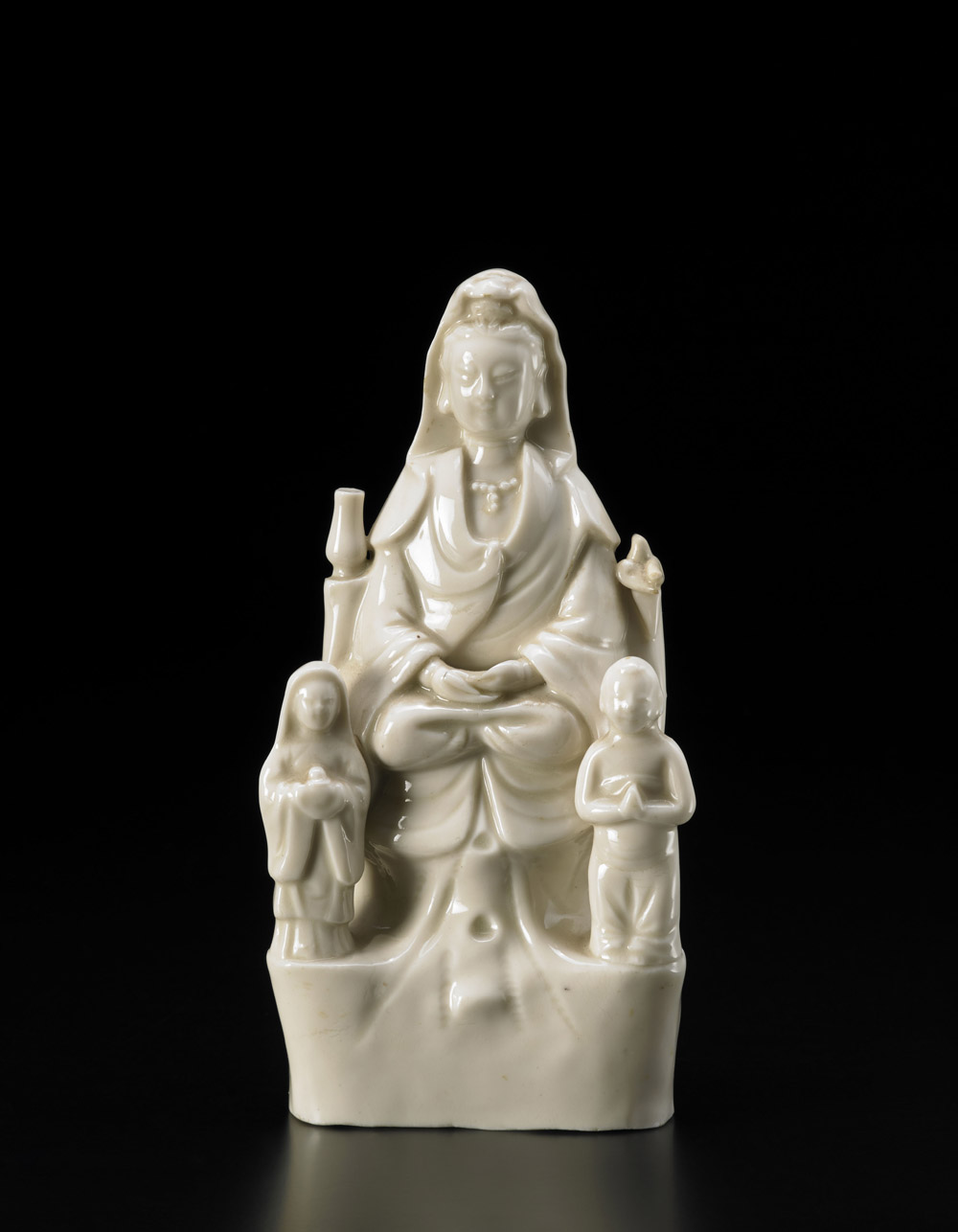 Figura di Guanyin in blanc-de-Chine, la divinità raffigurata seduta, con il capo coperto, indossa morbide vesti e collana con pendenti, accompagnata da due accoliti Cina, Dehua, XIX/XX secolo A blanc-de-Chine figure of Guanyin, depicted seated, with a hooded head, wearing long robes and beaded jewellery, accompanied by two acolytes China, Dehua, 19th/20th century (h cm 18)