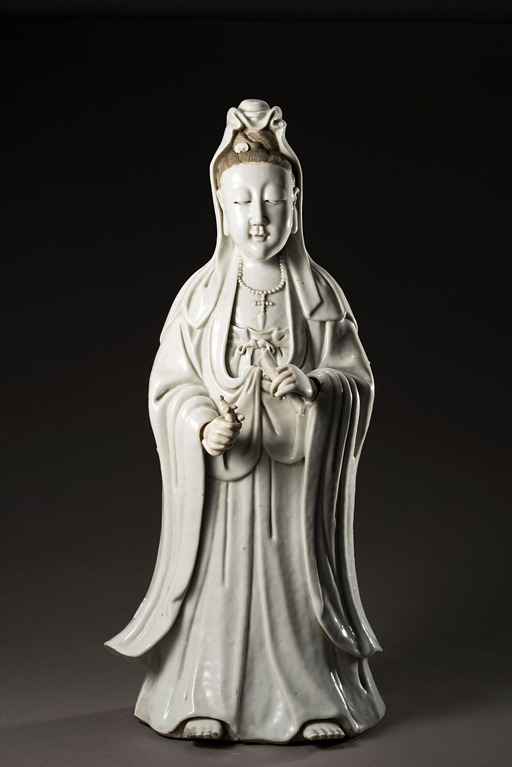 Lotto 66 | Antica Guanyin in blanc-de-Chine, il capo coperto, indossa lunghe vesti e...