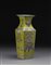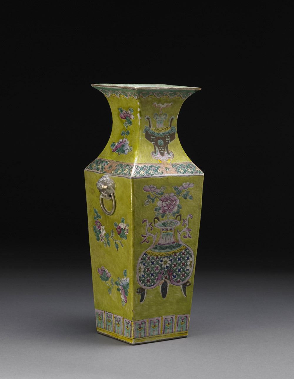 Vaso in porcellana Famiglia Rosa su fondo verde di forma rettangolare con bocca svasata, con doppie anse leonine dorate, decorato su ogni lato con uccelli di forma arcaica e rami fioriti, la base e l'interno in turchese Cina, sec. XIX A Famille Rose lime-green ground rectangular vase, with flaring neck applied with gilt lion head handles, decorated to each side with a archaistic vessels and flowers, the interior and the base in turquoise China, 19th century (h cm 40)