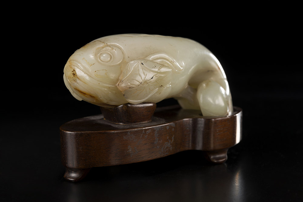 Carpa in giada color celadon e ruggine, modellata con una lunga coda ricurva, afferra tra le fauci delle foglie di loto, cava all'interno, la pietra con naturali inclusioni e venature più scure (piccole mancanze), base in legno Cina, sec. XIX A celadon and russet jade model of a long tailed carp, grasping a lotus stalk in its mouth, the interior hollow, the stone with natural darker inclusions and flaw lines (minor losses), wood base China, 19th century (h cm 10)